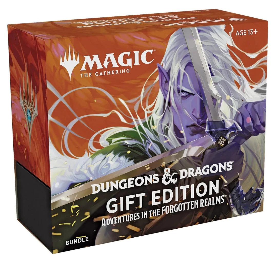 The Adventures in the Forgotten Realms Gift Bundle contains 10 Adventures in the Forgotten Realms Draft Boosters—the best boosters for drafting, plus 1 Adventures in the Forgotten Realms Collector Booster full of foils (total of 10 traditional foil cards), special card treatments (4–5 Showcase or Borderless cards, 2–3 Extended-Art cards), and 5 Rare and/or Mythic Rare cards. It also includes 3 oversized dungeon cards (Tomb of Annihilation, Dungeon of the Mad Mage, and Lost Mine of Phandelver), 40 basic lands (20 traditional foils and 20 nonfoils), 1 traditional foil alt-art promo card—Treasure Chest, 1 oversized Gift Edition d20, 1 special foil card storage box, and 2 reference cards.